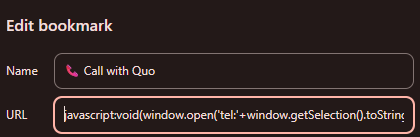 Right-click your Chrome bookmarks bar → Add page → name it 📞 Click to Call → paste this exactly into the URL field: