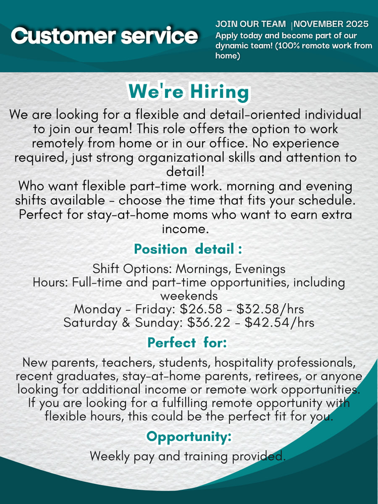We are looking for a flexible and detail-oriented individual to join our team as a Customer service!