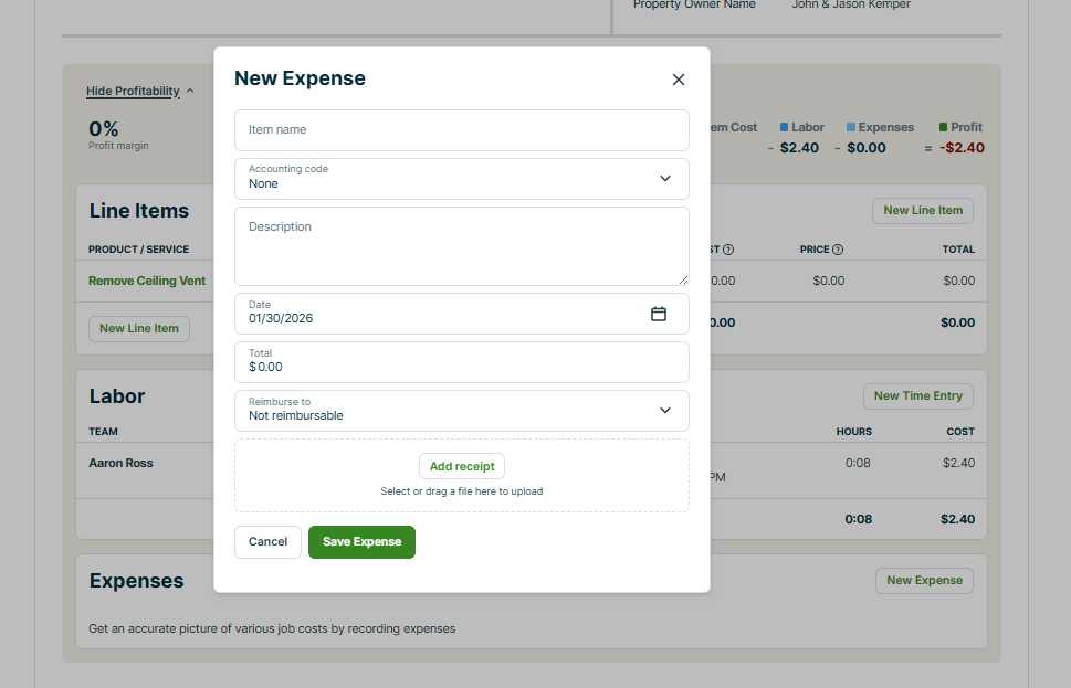 I have been inconsistent with adding expenses to each job. How are other jobber users adding expenses to each job to see your profitability per job? Are you having your techs keep track of parts/fittings used on a separate form and then adding that to the job after the job has been completed? Trying to find an easy way to keep track of this and get it entered into jobber.