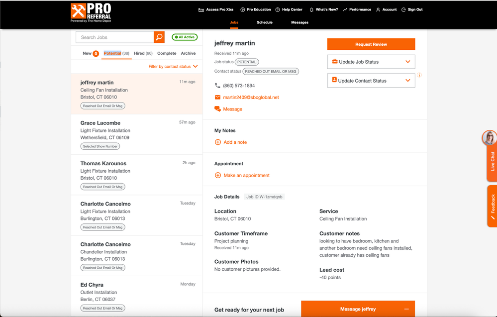 Since using jobber, I have had my office manager transfer every contact over, one by one, because it didnt allow us to track stats/communication within home depots crm.