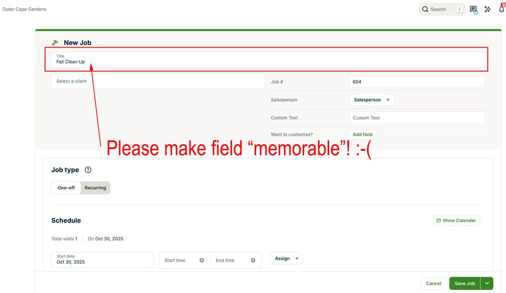 Arrrrgggg! I used to be able to start a new job, and when I clicked in the Title space and started typing, it would autofill from something I typed in there before. Now, it doesn't do it, and I hate typing out the word, "Maintenance" because it's long, and I usually make a typo. Please put the Job Form BACK the way it was...