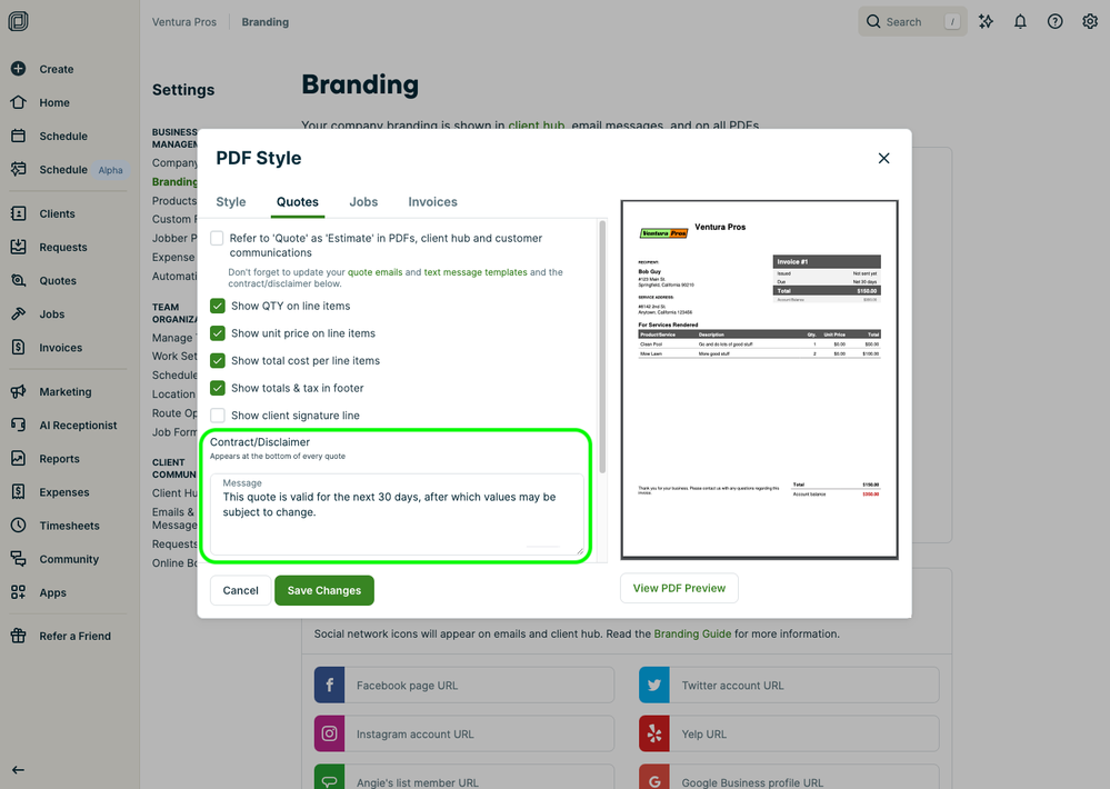 The best way to add terms and conditions to a quote would be to use the Contract/Disclaimer section. This can be accessed when creating quotes or via Settings > Branding > PDF Styles > Quotes > Contract/Disclaimer.